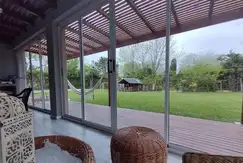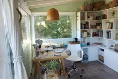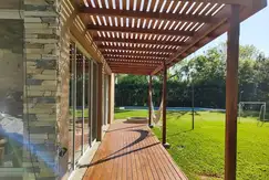 2 habitaciónes con placares, baño, living, comedor, cocina, otro baño, playroom o quincho de vidrio con baño y otra cocina, lavadero, galería cubierta de deck y otra galería cubierta