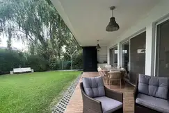 Parrilla cubierta con mueblería de hierro negro mate con pileta de manos. Amplia galería con mesa y espacio de living exterior.