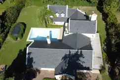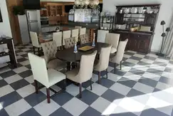 Pileta 10 x 5 revestida , baño completo seguida de importante pergola techada con luz equipada para 12 personas.