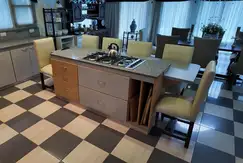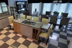 A la izquierda encontramos una hermosa y amplia ( 70m ) cocina / comedor con vista abierta , ventanales a pileta y parque