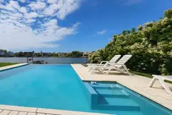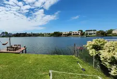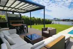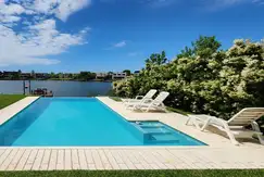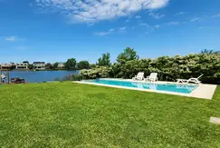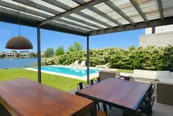 EXTERIOR: Galería cubierta con parrilla y sector de living, Gran Jardín parquizado, piscina con borde infinito, muy buen muelle con kajac.