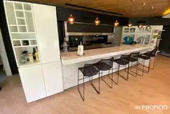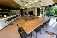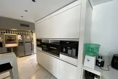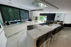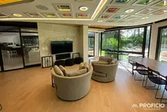 Al ingresar a la casa, serás recibido por un amplio hall de entrada que te llevará a través de un ascensor a la planta alta y al subsuelo. En la planta baja, encontrarás un espacioso living con vista al parque, una cocina comedor integrada con una gran isla y salida al quincho con parrilla y baño, así como un lavadero/despensa.