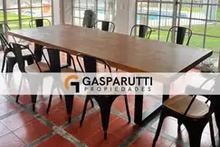 Amplio quincho cerrado con parrilla, horno a gas y mesada con bacha para lavado. Baño exterior para uso del quincho y pileta. Dependencia de servicio con baño y lavadero