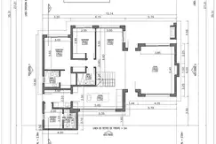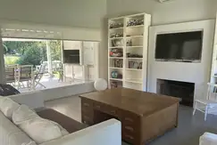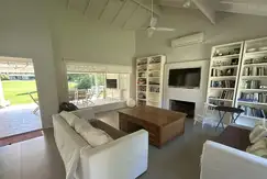 Planta baja amplio living con ventanales a ambos lados (golf y entrada) con hogar, techos de madera en blanco y comedor con vista al golf.