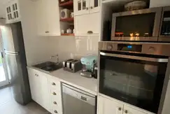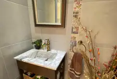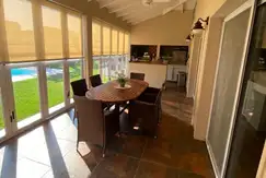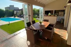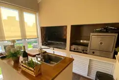 Galería con cerramiento plegable, con parrilla, parrilla a gas y horno pizzero. Baño exterior, vanitory mesada arabescato