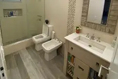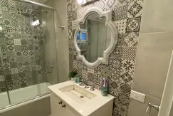 Baño central completo, con mampara. Vanitory mesada Marmol arabescato
