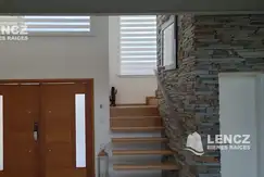 Exclusiva casa moderna de dos plantas, ubicada en un entorno residencial de gran categoría. Al ingresar, se encuentra un imponente hall de entrada con una puerta de madera doble, enmarcada por un diseño contemporáneo que destaca líneas limpias y ventanales altos, lo que permite el ingreso de abundante luz natural.