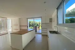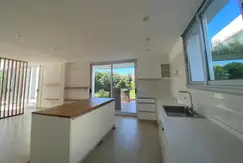 Separado por unas bigas de madera se encuentra la cocina, con espacios cómodos como para armar un comedor diario, en esta se encuentra una isla, lugar de guardado confortable, espacio para heladera doble y desde este podemos acceder al lavadero, que cuenta con ingreso desde la cocina o desde el exterior, con espacio para lavarropa, tender, secadora a calor y lugar de guardado con una amplia y cómoda mesada)
