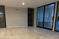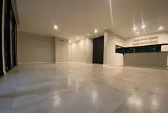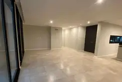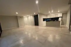 Amplio living comedor con cocina integrada, equipada con isla central, horno, anafe y mesadas en granito.