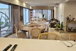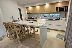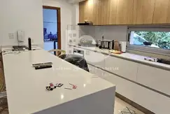 * Cocina integrada, (totalmente equipada, con bajo mesada y alacena de melamina de primera categoría, mesada de mármol blanco con bacha de acero inoxidable y canilla mono comando, piso de porcelanato, ventana sobre mesada con vista al parque, separada por una hermosa barra desayunador del living-comedor).