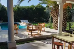 La casa también dispone de una habitación de servicio con placard y baño completo, además de un espacioso lavadero con despensa. La hermosa galería con parrilla es perfecta para tus asados, y la pileta con solárium te invita a disfrutar del sol. El riego automático mantiene el jardín siempre verde, y la cochera semicubierta protege tu vehículo.