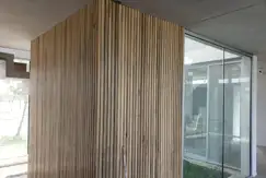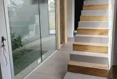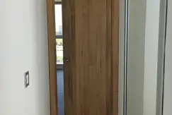 Todas las carpinterías interiores tienen una altura de 2,40m y tanto en planta alta como en el toilette, se realizó un revestimiento madera para darle calidez a los ambientes.