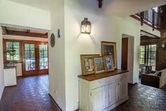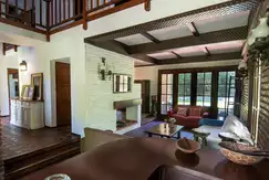 Planta baja: Living comedor con hogar a leña, ventanales hacia el jardín con salida a la galería. Doble circulación. Detalles de madera en aberturas y techos.