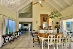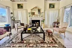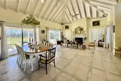 Living con hogar a leña y comedor, con techo muy alto que llena de luz el gran ambiente. Salida a la galeria, con vista a la pileta y al jardín.