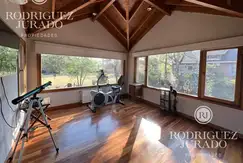 Planta Baja: Recepción, toilette, living con hogar, comedor, cocina, lavadero con acceso de servicio, amplio family con gran paño fijo con vista al jardín, 2 dormitorios que comparten baño completo (uno con placard y el otro con vestidor), 1 dormitorio en suite con baño con ante baño, 2 escaleras de acceso a la planta alta. Cochera cubierta para 2 autos, galería cubierta, parrilla, gabinetes de guardado de elementos de jardín.