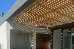 Exterior: Galería, jardín con parrilla y pérgola para un auto.