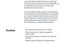 Cultura ecológica. Diseño orgánico de los espacios, para simplificar la movilidad. Bicicletas de uso público y un trazado de lagos interconectados que permite llegar navegando a cualquier punto de la ciudad. Un proyecto paisajístico desarrollado en función de la flora autóctona y un programa de arte público.