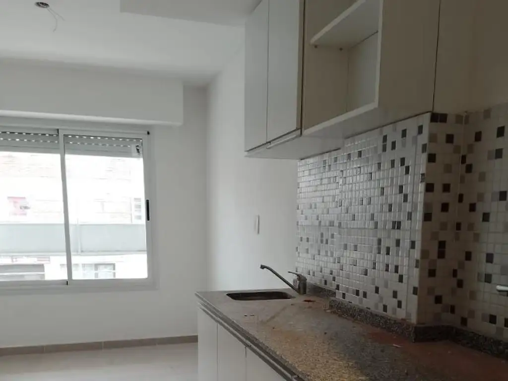 El departamento consta de una cocina integrada con bajo mesada, alacenas, artefacto de cocina a gas y termotanque eléctrico, conexión para lavarropas, ventana al frente, un baño completo con bañera, y un dormitorio con ventana al frente.