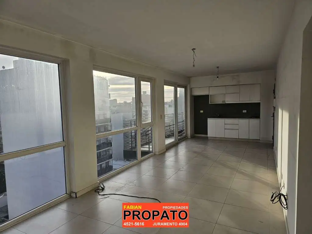 Amplio ambiente con cocina integrada (posee hornallas y termotanque eléctrico), balcón al frente de 3 m2, hall de distribución con placard con sus interiores hechos y baño completo con bañera.
