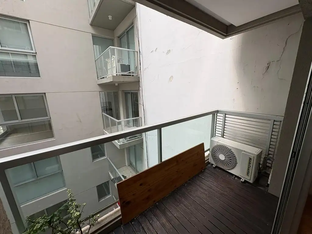Ambiente con balcón, baño completo, cocina integrada.
