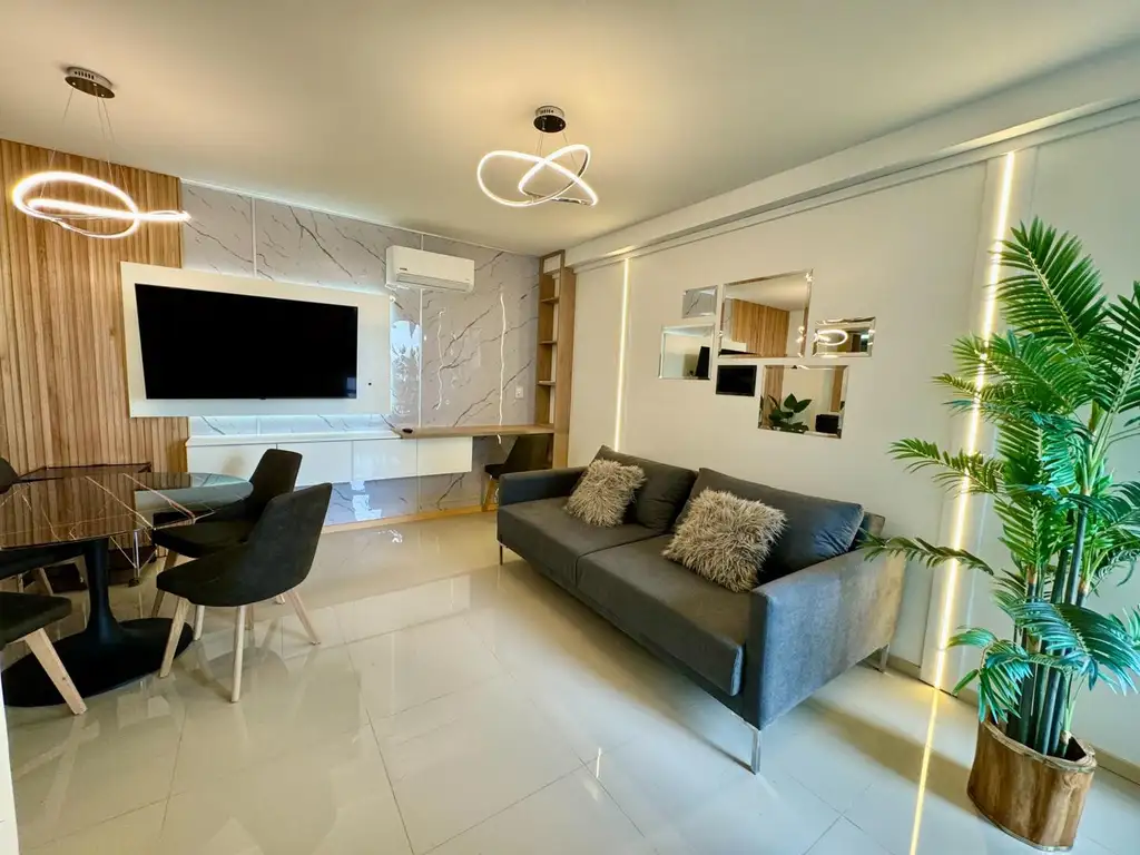 Hermoso living comedor, comodo, luminoso y con muebles de diseño. El living cuenta con sofá cama.