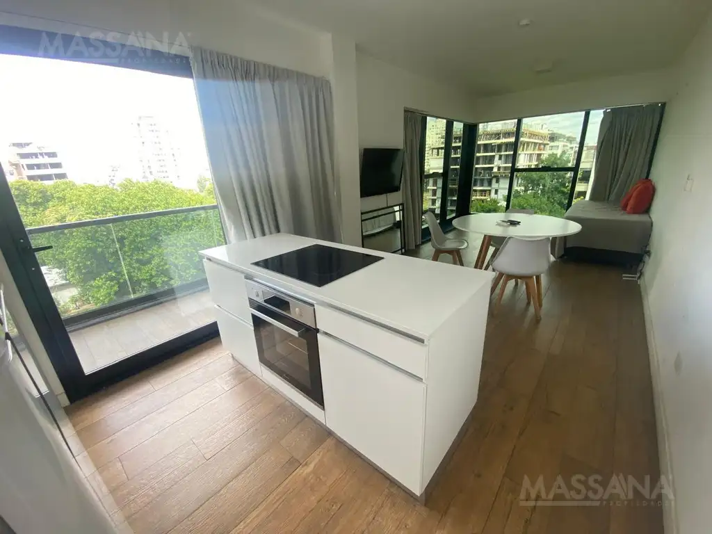 Amplio living comedor con vista abierta al Nuevo Parque . Cocina integrada con muebles sobre y bajo mesada. Toilette
