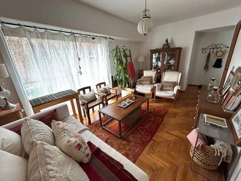 El inmueble presenta un living amplio y luminoso con pisos de parquet, conectado a un balcón francés que permite el ingreso de luz natural y una cocina integrada con comedor diario.
