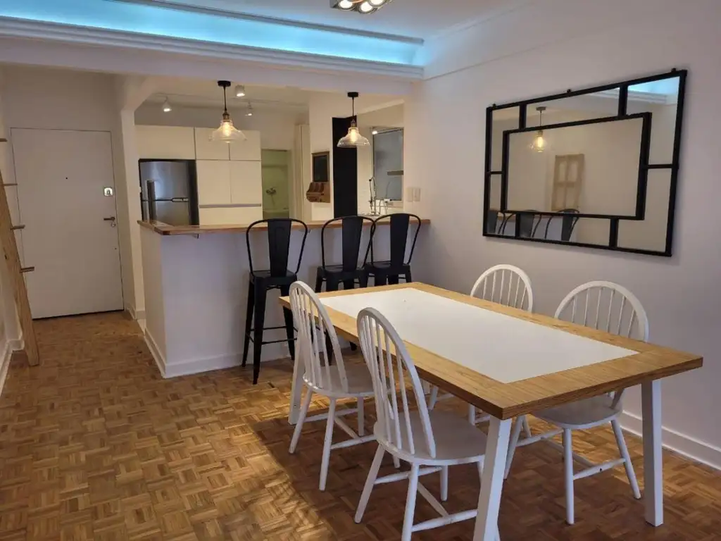 Tres ambientes lindísimo, TOTALMENTE AMOBLADO, equipado, living comedor amplio, mesa grande sillas cómodas, living con confortables sillones , tele grande, muebles, prácticos , adornos , con balcón grande al contrafrente lleno de plantas , pulmon abierto, re luminoso, cocina con barra, espacio para comer con mesa y sillas heladera, lavadero aparte, grande, con tender y lavarropas impecable, baño de servicio.-dos cuartos uno en suite, gran placards, baño en suitte, y balcon corrido.- persianas electricas.- Aire acondicionados.- segundo cuarto al pulmon, tranquilo, buenos placards, otro baño completisimo.-ZONA de lindos lugares para salir con programas gastronomicos, a una cuadra de CABILDO, lleno de transportes.- Servico centrales.-,cochera fija y cubierta. bajas expensas