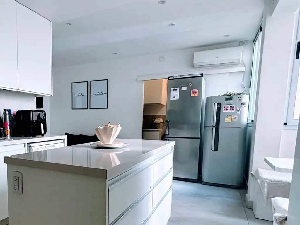 Cocina moderna reciclada con isla de silestone, anafe de vitro cerámica y horno eléctrico, playroom (antiguamente un cuarto de servicio), comedor diario, lavadero independiente con alacenas.