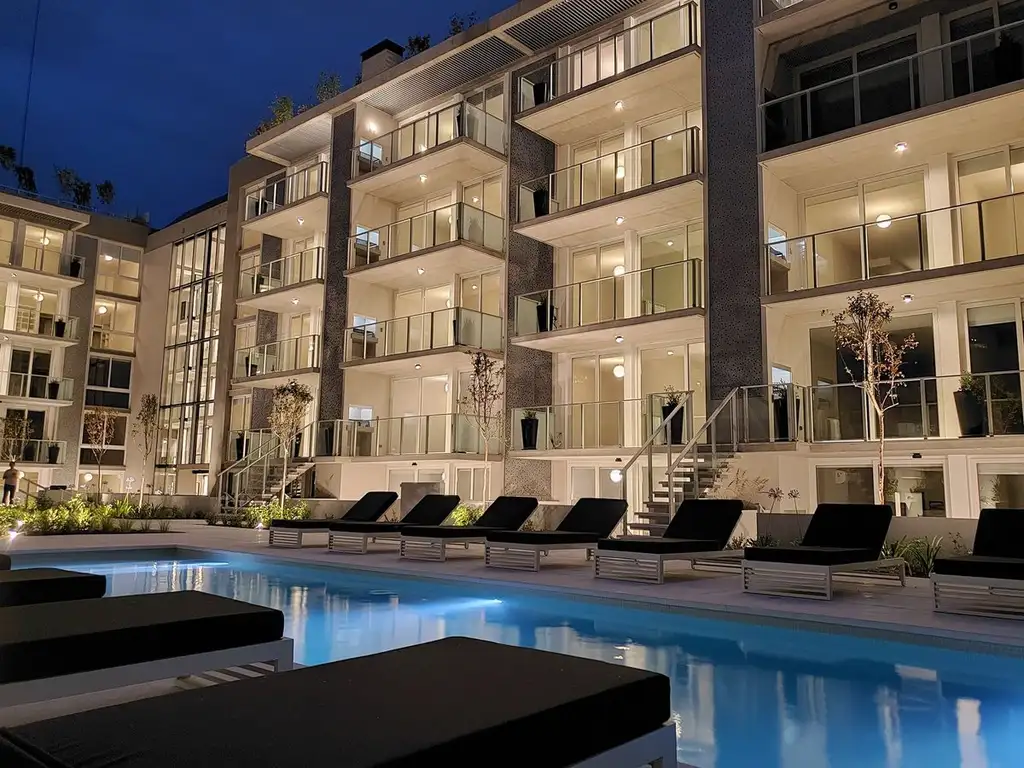 El edificio se implanta formando un L en un predio de 1700 dejando un espacio central de esparcimiento con pileta, solárium y jardín. Se desarrolla en Planta Baja y 4 niveles, permitiendo asolamiento y excelente orientación para las unidades.
