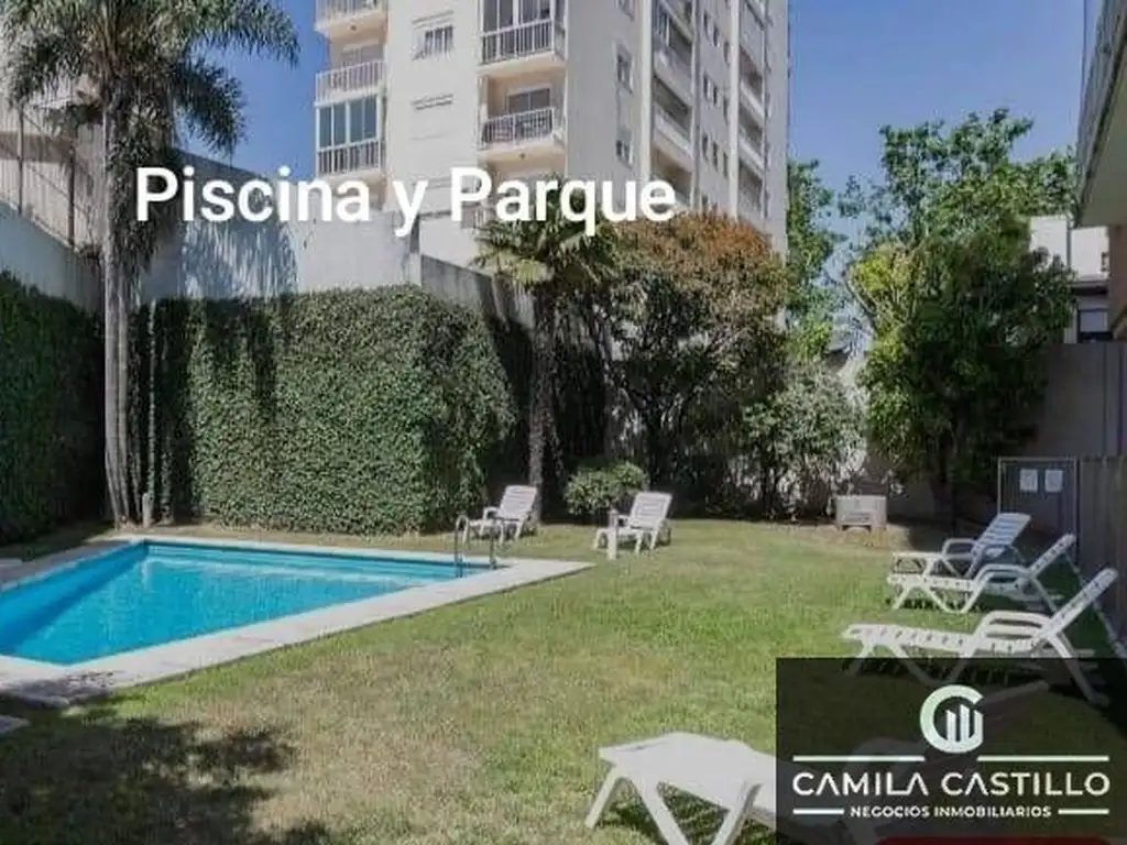 Alquiler departamento amoblado en edificio con parque y piscina.