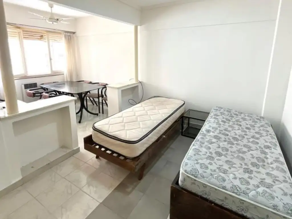 Ambiente único de amplias dimensiones con gran espacio de guardado, ventanal al contrafrente, 2 camas de 1 plaza, mesa y sillas.