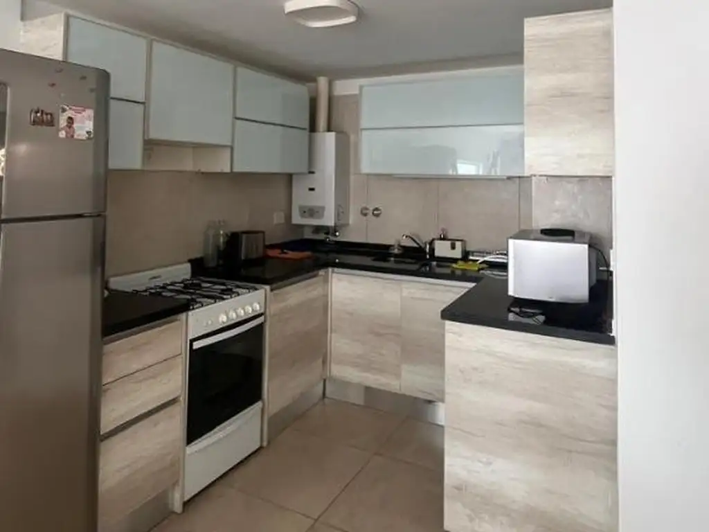 Living comedor con cocina semi integrada gigante, alacena y bajo mesada amplios.