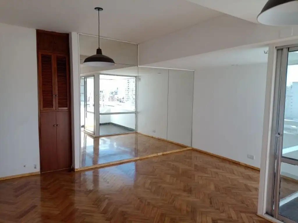 :: Estar comedor con pisos de parquet, con gran espejo y balcón.