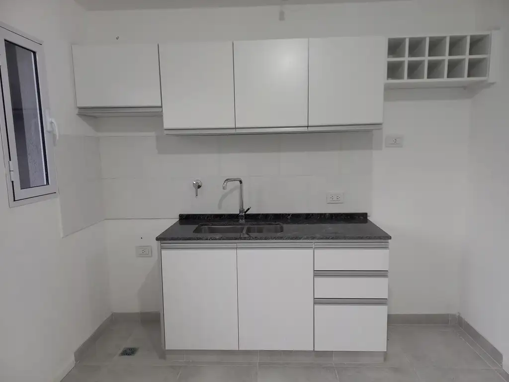 Amplio living estar integrado con cocina comedor diario, con muebles laqueados en color blancos en bajo mesada y alacena con bodega, bacha de acero ixoxidable 1ra. Calidad marca Jhonson y grifería monocomando de 1ra. Calidad marca Piazza.
