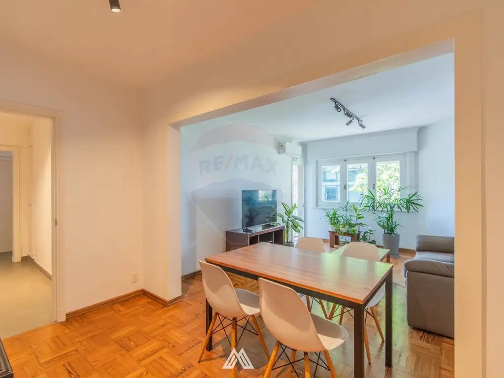 Se accede a living comedor al frente con salida a cómodo balcón. Cocina definida reciclada a nuevo, con horno, anafe y calefón, toilette social, baño principal completo también reciclado, con conexión para lavarropas y calefón. Pisos de parquet y aire acondicionado en living y uno de los dormitorios.