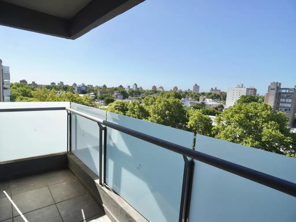 Balcón amplio con espacio para lavarropas, frente vidriado.