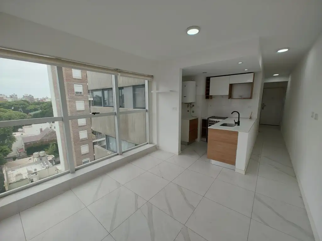 La unidad cuenta con estarcomedor con cocina integrada, un ambiente cómodo y funcional, con amplios ventanales que aportan muy buena luz natural. El espacio dispone de cortinas roller instaladas, aire acondicionado y salida directa al balcón, generando una agradable conexión interiorexterior.