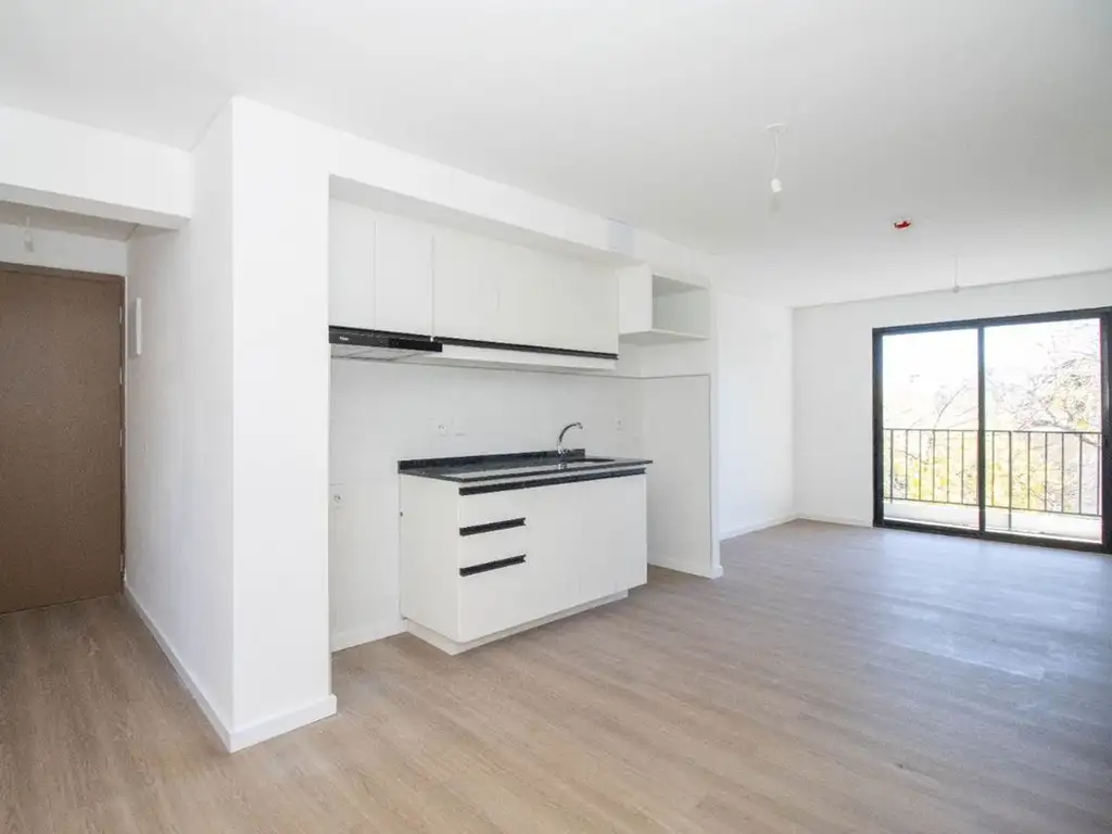 Cuenta con un living comedor, con un gran ventanal con salida a un cómodo y disfrutable balcón. La cocina integrada con muebles aéreos y bajo mesada y viene instalada la campana de extracción.