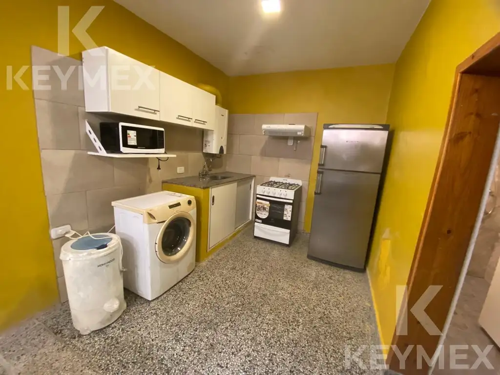 Calefón. Cocina. Muebles sobre y bajo mesada. Heladera. Microondas. Lavarropas y secarropas. Televisor.