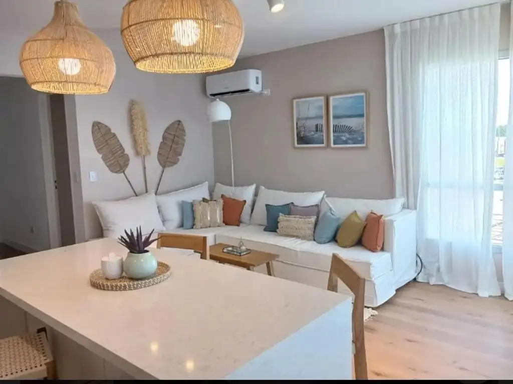 Departamento amueblado por diseñador, super equipado, 3 ambientes, Posee 2 Habitaciones, 2 baños, 1 cochera, Aire acondicionado frio/calor, Smart Tv 58 pulgadas, Cocina con equipamiento full, balcón/terraza apaisado, Primera linea de playa con vista panorámica a la laguna,