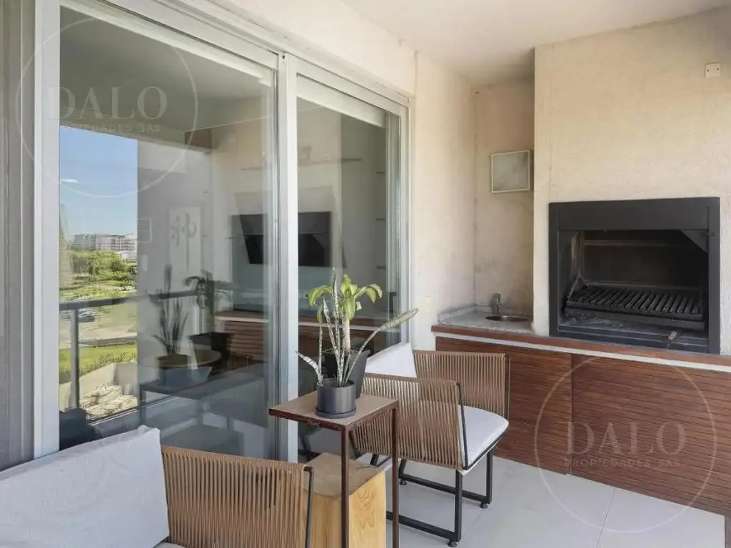 El balcón aterrazado con parrilla, de orientación norte, ofrece vista abierta al barrio Golf y al agua, garantizando sol y luz natural durante todo el día.