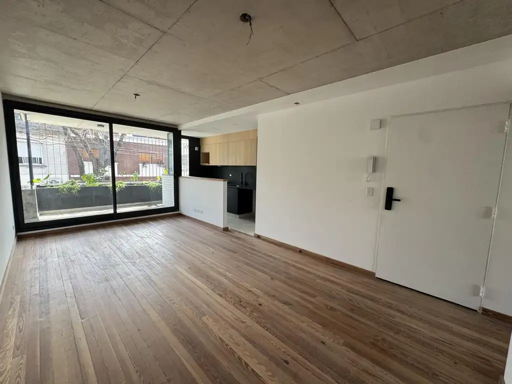 Living comedor al frente con balcón aterrazado. Cocina integrada separada con una barra.