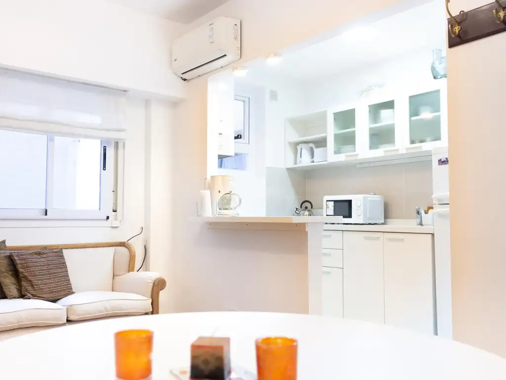 En la zona de living comedor se encuentra la mesa con dos sillas y un cómodo sofá y aire acondiciona frió/calor, el ambiente está cuidadosamente amoblado y decorado para ofrecer un ambiente cálido y confortable.
