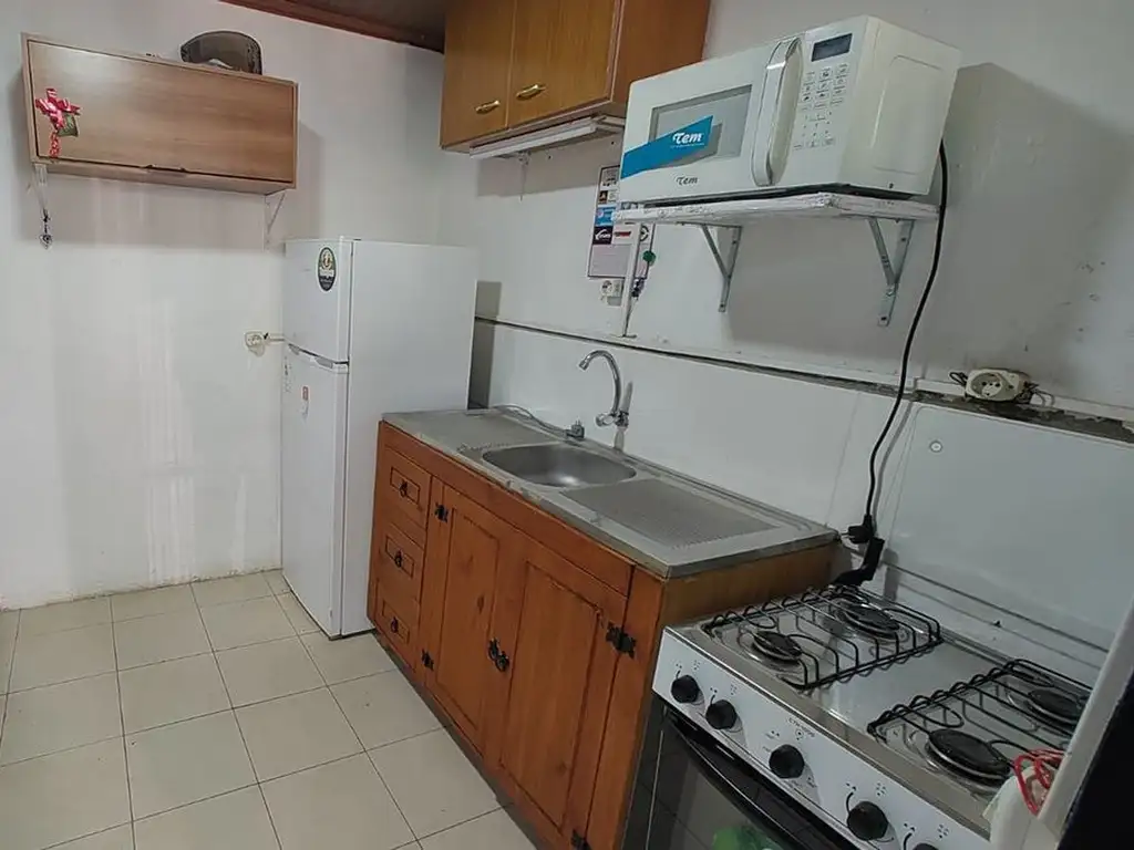 Cómodo y funcional apartamento que cuenta con 1 dormitorio, cocina/comedor integrado y cocina equipada con bajo mesada y muebles aéreos, mesa, sillas.