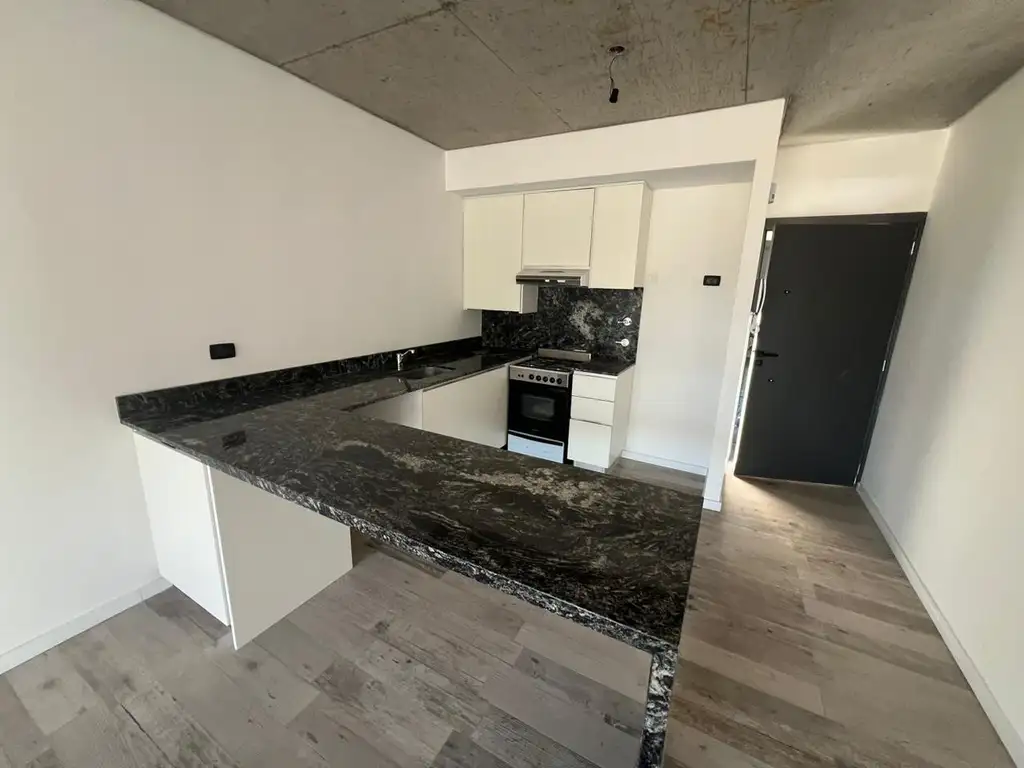 Cuenta con hall de entrada, gran cocina integrada con mesada, amplio living-comedor con ventanal, baño completo con bañadera, 1 dormitorio con placard a la vista de madera (el modelo es sin frente) y un segundo dormitorio con frente de placard (sin interiores) mirando hacia el exterior. Amplio balcón cubierto.