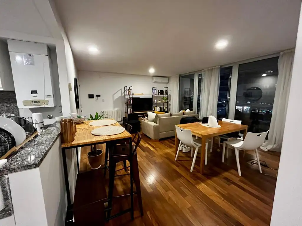 El inmueble cuenta con 1 dormitorio muy cómodo, con placares empotrados. Amplio y luminoso estar comedor con grandes ventanales que integran perfectamente el espacio social. Cocina semi integrada con muebles altos y bajos, y espacio para lavadero.