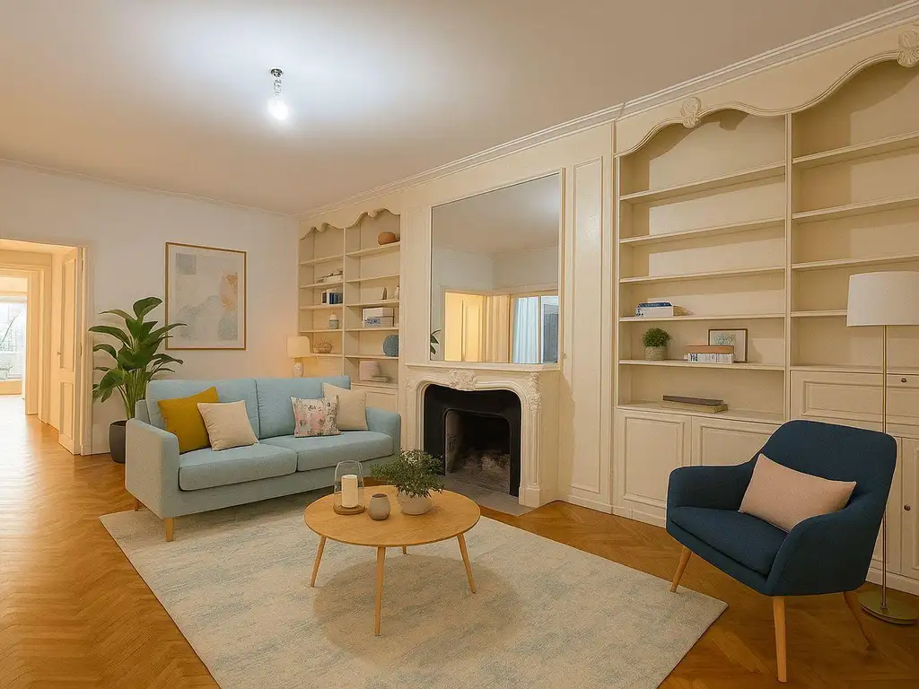 En un 4o piso al frente, se ofrece este amplio semipiso con palier privado y entrada de servicio. Al ingresar, un hall recibidor conduce a un generoso living de 7 x 3,71 metros con aire acondicionado frío/calor, chimenea decorativa y un elegante mueble espejado de guardado. El comedor independiente, de 4 x 4,63 metros, completa el sector social de la unidad.