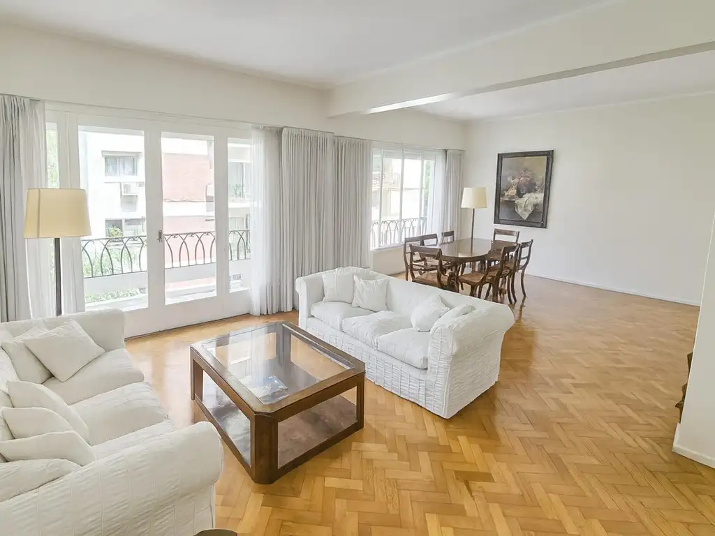 ALQUILER AMOBLADO | FRENTE A PLAZA V. LÓPEZ | VISTA ÚNICA Espectacular piso de 147 m² con balcón corrido al frente. 3 Dormitorios + Dependencia completa. Full amenities: Calefacción, Aire Acondicionado y Agua Caliente Centrales. Edificio de categoría. Cochera Opcional (N°2, muy cómoda) y Baulera.