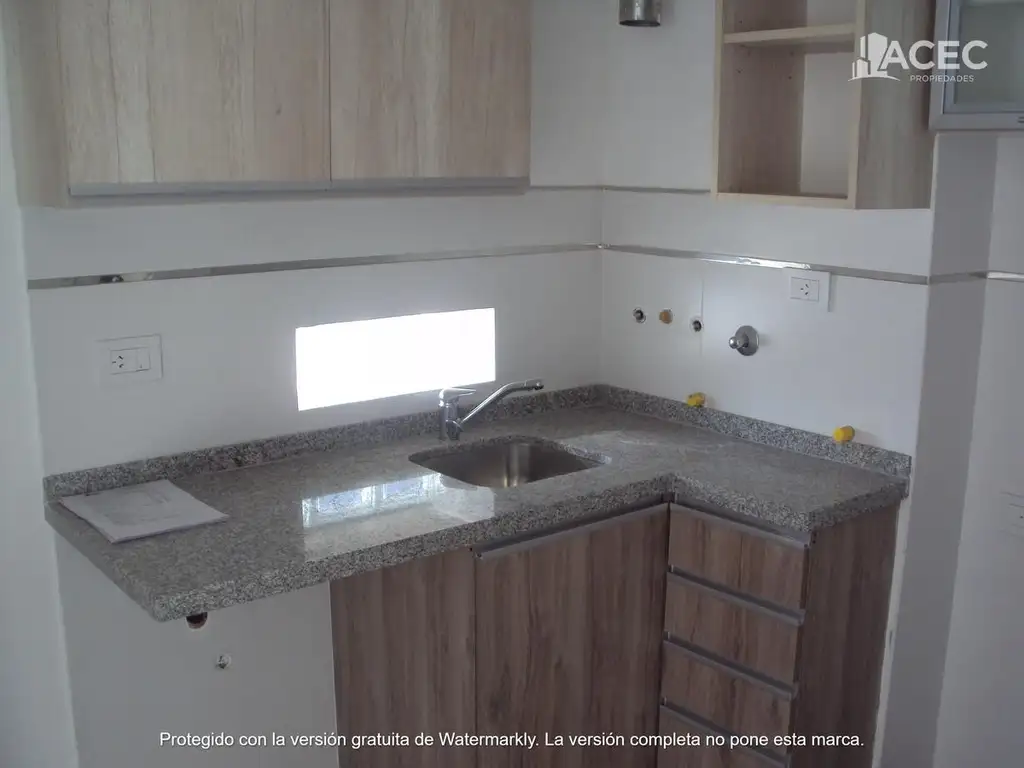 Cocina semi - integrada con alacenas y bajo mesadas en mdf enchapado en símil madera, mesadas de piedra granítica, bacha de acero inoxidable y grifería monocomando, espacio y conexión para lavarropas,